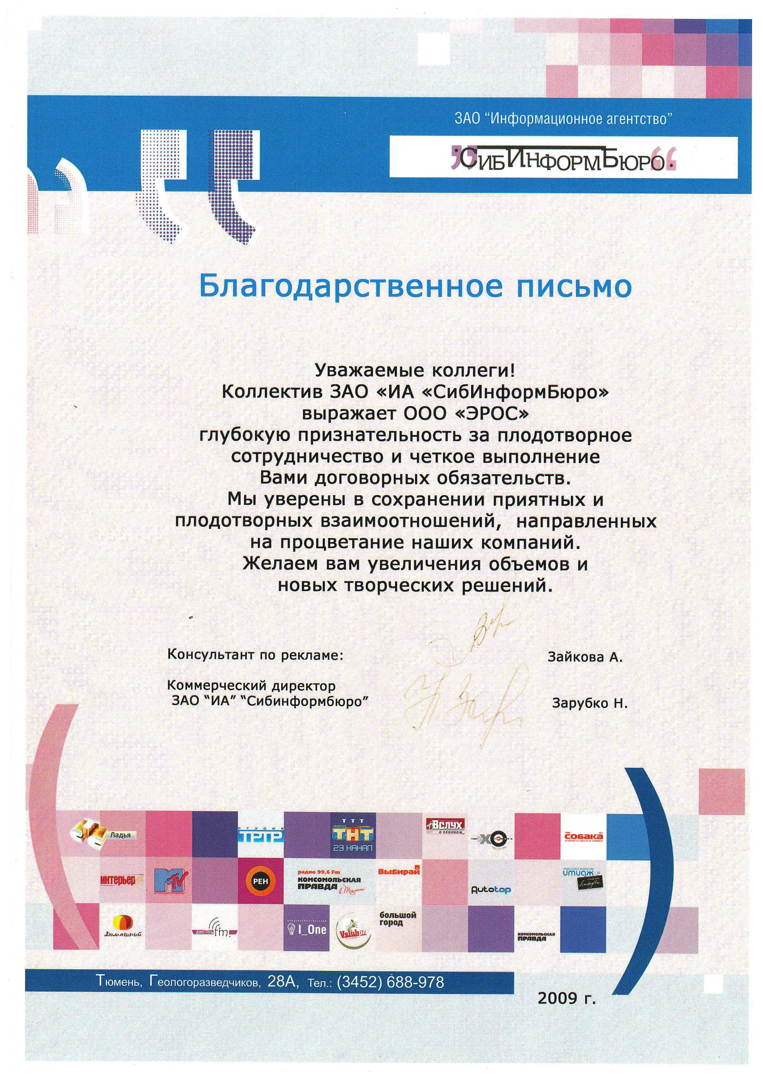 Коллектив ЗАО "ИА "СибИнформБюро"выражает ООО "Эрос" глубокую признательность за плодотворное сотрудничество и четкое выполнение Вами договорных обязательств. Мы уверены в сохранении приятных и плодотворных взаимоотношений, направленных на процветание наших компаний.